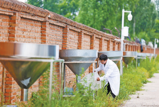 北京延庆监测点的探照灯诱虫器,工作人员正在安装集虫网袋。