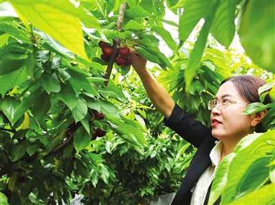 走进户外采摘区,高大的樱桃树分列青石路两边,品种有红灯樱桃、先锋樱桃、黄蜜樱桃和萨米脱樱桃。红灯樱桃个头不大,成熟果实红得发紫,摘下一颗放进口里,皮薄肉厚,酸甜多汁,让人回味无穷。一旁有几株杏树,大黄杏多已熟透,有的已经自然掉落。“黄杏个头稍大,比较常见。你跟我来看,这边的梅杏个头小,果实带点粉红色,颜值是不是很高?”郭艳霞踮起脚尖,摘下一颗塞进记者手里。闻一闻,清香扑鼻,用手擦抹两下,轻咬一口,软糯香甜,是小时候的味道。