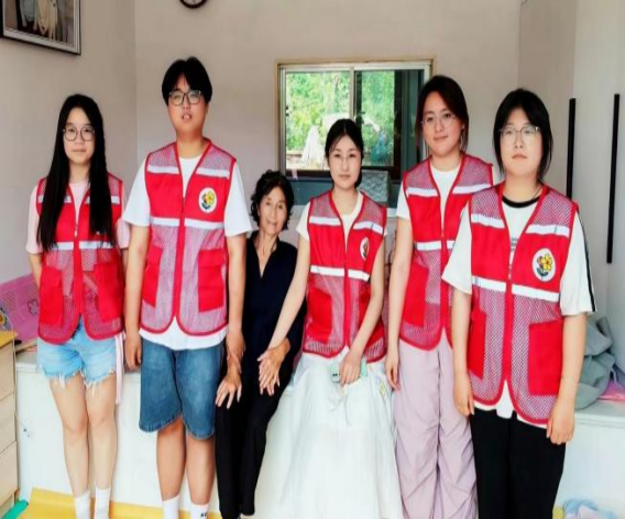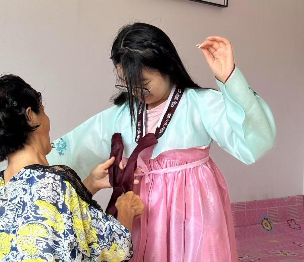 穿过蜿蜒的丹集公路,实践团抵达“宽甸县下露河朝鲜族乡”——“辽宁唯一的朝鲜族乡镇”。在通江村,他们发现这里许多老人子女常年在外务工,常常只有两位老人在家中作伴。于是,他们前往独居老人的家中进行走访慰问,热情的奶奶拿来了自酿的山楂水解渴给成员们消暑解渴,向学员们展示朝鲜族传统服饰,并热情的邀请他们试穿,老奶奶为他们讲述了那一件件民族服饰背后的故事。那衣裙上的点点纹样,仿佛触摸到了这个民族独有的浪漫,这一刻,思想政治教育不再是课本上的字,而是鲜活的文化与深深的民族认同。