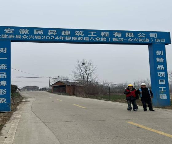 在八众路(槐店-众兴街道)提质改造项目现场,“安徽民昇建筑工程有限公司”的蓝色门头格外醒目。 这条全长数公里的道路,不仅是连接众兴街道与周边村庄的交通动脉,更是渠道工程材料运输、后续管护的关键通道。项目围挡上“对一流品牌形象,创精品项目工程”的标语,映照着建设者们的决心。