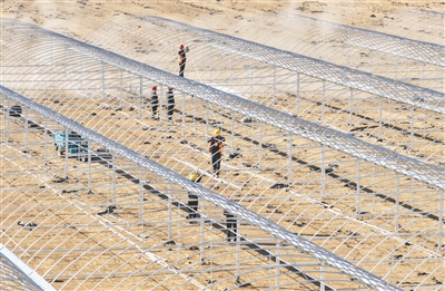近日,在巴彦淖尔市乌拉特前旗“佘太红”设施农业基地建设现场,工人们正在搭建温室大棚钢架。该地块曾是长期荒废、无人耕种的盐碱地,基地通过“科技改良+设施农业”模式,重点种植番茄、薄皮甜瓜等高附加值农产品。基地建成后,将为当地提供2000多个就业岗位,预计带动就业增收约3300万元。 内蒙古日报记者 薛来 摄