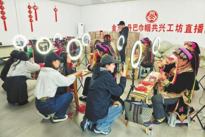 “浙川一家亲,共铸山海情”浙川东西部协作主题采访中,记者聚焦丹巴来料加工创业基地直播间的丹巴绣娘。四川日报全媒体记者 华小峰 摄