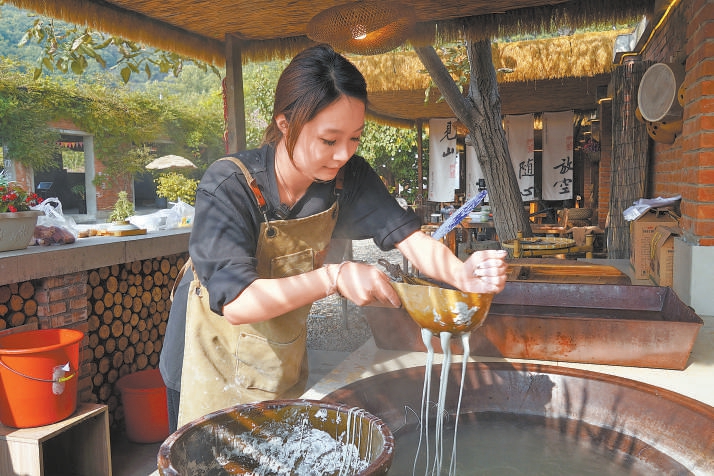 田欣博雅制作“漏粉”。 实习记者 夏一丹摄北京日报记者 孟紫薇秋日正午,密云区溪翁庄镇尖岩村一处小院里,灶台火旺,大锅里沸水翻腾。田欣博雅将黏糯的红薯粉团放进葫芦瓢,先观察其自然垂落状态,然后利落地将粉瓢移至滚水上方。她一手端瓢匀速转动,一手轻捶瓢沿,粉浆如银线般从瓢孔中泻下,在水中瞬间...
