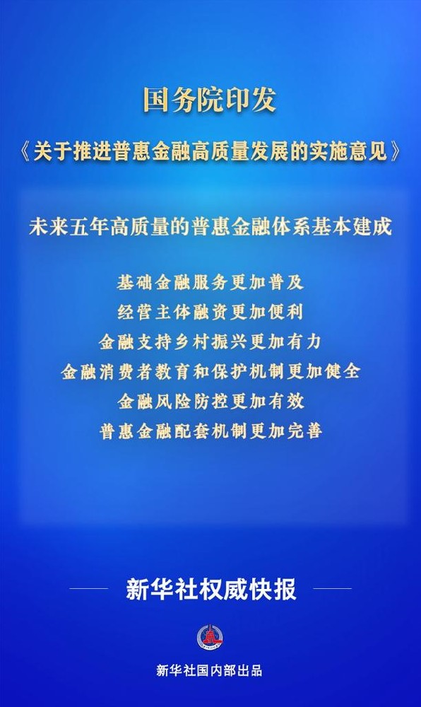 国务院日前印发《关于推进普惠金融高质量发展的实施意见》,明确未来五年推进普惠金融高质量发展的指导思想、基本原则和主要目标。...
