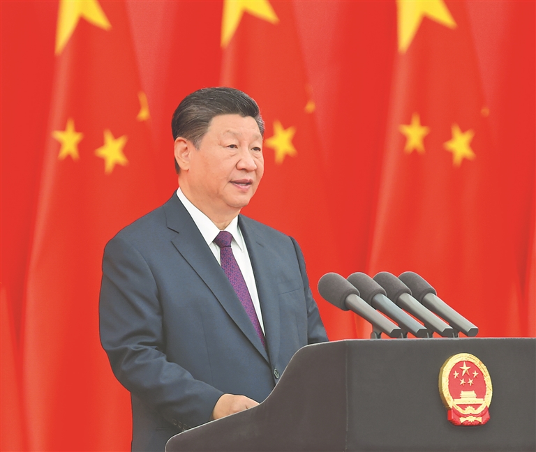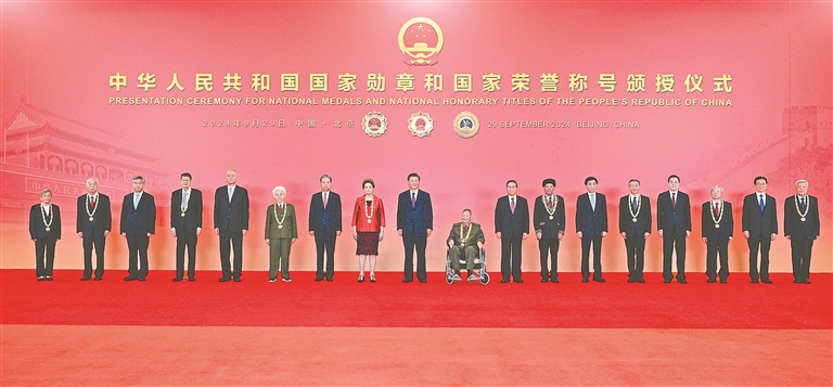 新华社北京9月29日电 中华人民共和国国家勋章和国家荣誉称号颁授仪式29日上午在北京人民大会堂金色大厅隆重举行。中共中央总书记、国家主席、中央军委主席习近平向国家勋章和国家荣誉称号获得者颁授勋章奖章并发表重要讲话。习近平强调,伟大时代呼唤英雄、造就英雄。英雄辈出,党和人民事业就会兴旺发达、长盛不衰。各级党委和政府要关心关爱英雄模范,推动全社会尊崇英雄、学习英雄、争做英雄。希望受到表彰的同志珍惜荣誉、再接再厉,争取更大荣光。 李强、赵乐际、王沪宁、丁薛祥、李希、韩正出席颁授仪式,蔡奇主持。 9时许,国家勋章和国家荣誉称号获得者集体乘坐礼宾车从住地出发,由礼宾摩托车队护卫前往人民大会堂。人民大会堂东门外,礼兵分列道路两侧,青少年热情欢呼致意。国家勋章和国家荣誉称号获得者沿着红毯拾级而上,进入人民大会堂。党和国家功勋荣誉表彰工作委员会有关领导同志等,在这里集体迎接他们到来。 人民大会堂金色大厅,气氛庄重热烈。巨幅红色背景板上,共和国勋章、友谊勋章和国家荣誉称号奖章图案熠熠生辉。背景板前,18面鲜艳的五星红旗分列两侧,18名英姿挺拔的礼兵持枪伫立。 9时58分,在欢快的乐曲声中,习近平同国家勋章和国家荣誉称号获得者一同步入会场,全场起立,热烈鼓掌。 10时整,军乐团号手吹响仪式号角,颁授仪式开始。《义勇军进行曲》奏响,全场高唱国歌。 蔡奇宣读习近平签署的中华人民共和国主席令。主席令指出,为了庆祝中华人民共和国成立75周年,隆重表彰为新中国建设和发展作出杰出贡献的功勋模范人物,弘扬民族精神和时代精神,根据第十四届全国人民代表大会常务委员会第十一次会议的决定,授予王永志等4人“共和国勋章”,授予迪尔玛·罗塞芙“友谊勋章”,授予王小谟等10人国家荣誉称号。 2名旗手高擎五星红旗,3名礼兵手捧共和国勋章、友谊勋章和国家荣誉称号奖章,迈着雄健的步伐,行进到仪式现场。 在雄壮的《向祖国英雄致敬》乐曲声中,习近平为国家勋章和国家荣誉称号获得者颁授勋章奖章,并同他们亲切握手、表示祝贺,全场响起一阵阵热烈的掌声。少先队员向功勋模范人物献上美丽的鲜花,敬礼致意。 在全场热烈的掌声中,习近平发表重要讲话。他首先代表党中央、全国人大、国务院和中央军委,向获得“共和国勋章”和国家荣誉称号的英雄模范、获得“友谊勋章”的国际友人表示热烈祝贺、致以崇高敬意。 习近平指出,新中国成立75年来,中国共产党团结带领全国各族人民,创造了经济快速发展和社会长期稳定两大奇迹,伟大祖国发生了翻天覆地的变化,中华民族伟大复兴进入了不可逆转的历史进程。在这个波澜壮阔的发展历程中,各条战线涌现出一批又一批英雄模范。今天受到表彰的同志就是其中的杰出代表。他们的先进事迹和突出贡献将永载共和国史册,他们忠诚、执着、朴实的优秀品格值得全党全国各族人民学习。 习近平强调,我国正处于以中国式现代化全面推进强国建设、民族复兴伟业的关键时期。全党全国各族人民要以英雄模范为榜样,团结奋进、砥砺前行,汇聚起共襄强国盛举的磅礴力量。要胸怀强国之志,以国家富强为念,以人民幸福为盼,忠心爱国、矢志报国,把个人小我融入国家大我,在为国尽责、为民服务中实现个人价值、展现人生风采。要锤炼强国之技,顺应时代发展新要求,学习新知识、掌握新技能、练就真本领,干一行爱一行,钻一行专一行,努力成为善于干事创业的岗位能手、行家里手。 要勇建强国之功,以只争朝夕的历史主动、主人翁的责任担当,锐意进取、迎难而上,追求卓越、精益求精,在平凡岗位上创造不平凡的业绩,在破解发展难题、攻克改革难关、维护社会和谐稳定上不断有所作为。 习近平指出,75年来,世界上有很多与中国人民志同道合、风雨同舟的老朋友、好朋友,今天被授予“友谊勋章”的迪尔玛·罗塞芙女士就是其中的杰出代表。中国人民永远不会忘记那些为中国发展、增进中国人民同各国人民友谊作出突出贡献的国际友人。中国人民愿携手世界各国人民,维护世界和平,促进共同发展,推动构建人类命运共同体,开创人类更加美好的未来。 习近平强调,新的画卷需要我们共同描绘,新的历史需要我们共同开创。要锚定目标、勠力同心、开拓进取,共同谱写人民共和国更加绚丽精彩的新篇章。 颁授仪式上,“共和国勋章”获得者黄宗德、“友谊勋章”获得者迪尔玛·罗塞芙代表国家勋章和国家荣誉称号获得者发言。 颁授仪式后,习近平等领导同志同国家勋章和国家荣誉称号获得者合影留念。 在京中共中央政治局委员、中央书记处书记,部分全国人大常委会副委员长,国务委员,最高人民法院院长,最高人民检察院检察长,部分全国政协副主席,中央军委委员出席颁授仪式。 中央党政军群有关部门和北京市负责同志,国家勋章和国家荣誉称号获得者亲属代表、所在单位代表,以往功勋荣誉表彰获得者代表,有关国家驻华使节,各界干部群众代表等约1000人参加颁授仪式。