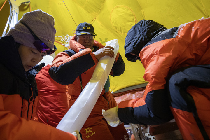 在普若岗日冰原,徐柏青(中)在封装钻取的冰芯。新华社记者姜帆 摄