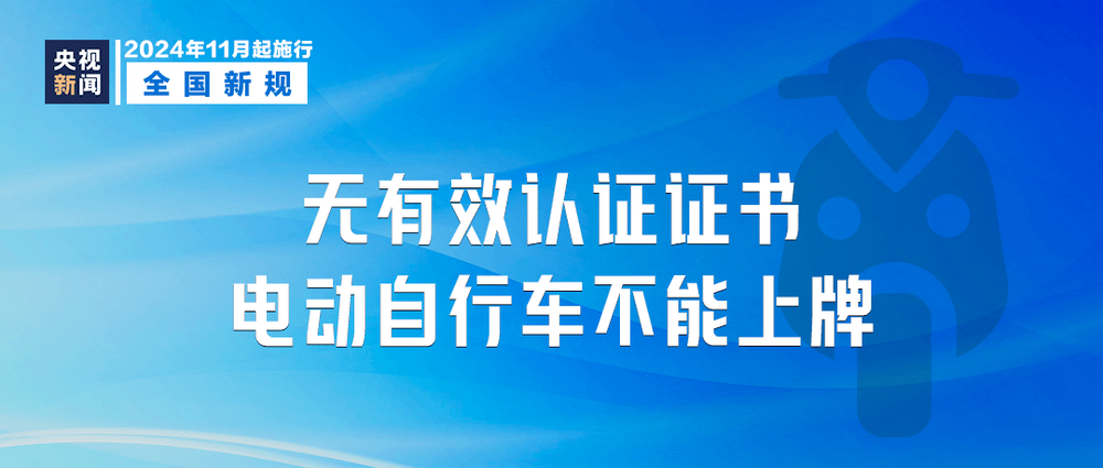 《关于加强电动自行车产品准入及行业规范管理的公告》11月1日起施行。公安交管部门对2024年11月1日后销售的、不具有有效认证证书的电动自行车不予办理登记上牌。