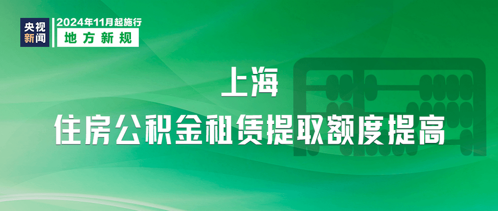 上海市《关于优化本市住房公积金租赁提取业务相关事项的通知》11月1日起施行,明确在上海市无自有住房、依法租赁市场租赁住房的,每户家庭(含单身家庭)月提取限额由3000元提高到4000元。