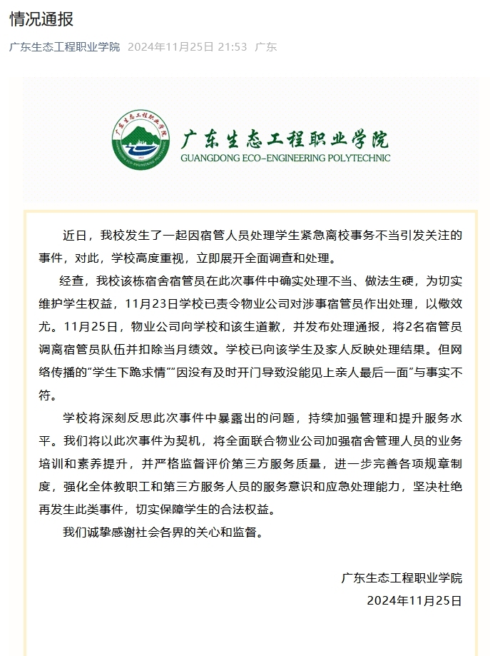 经查,该校该栋宿舍宿管员在此次事件中确实处理不当、做法生硬,为切实维护学生权益,11月23日该校已责令物业公司对涉事宿管员作出处理,以儆效尤。11月25日,物业公司向该校和该生道歉,并发布处理通报,将2名宿管员调离宿管员队伍并扣除当月绩效。学校已向该学生及家人反映处理结果。但网络传播的“学生下跪求情”“因没有及时开门导致没能见上亲人最后一面”与事实不符。