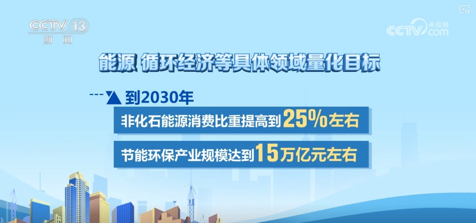 《意见》还针对能源、循环经济等具体领域提出一些量化目标。比如,到2030年,非化石能源消费比重提高到25%左右;节能环保产业规模达到15万亿元左右。
