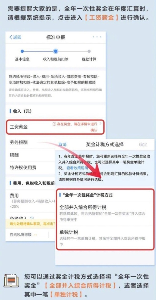 2024年度个税汇算正在进行中。1个细节可能决定退税还是补税:申报过程中,如发现需要补税,可以试试调整奖金计税方式↓↓