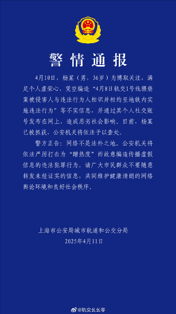 央视网消息:据上海市公安局城市轨道和公交总队官方微博消息,上海市公安局城市轨道和公交分局4月11日通报:4月10日,杨某(男,36岁)为博取关注,满足个人虚荣心,凭空编造“4月8日轨交1号线猥亵案被侵害人与违法行为人相识并相约至地铁内实施违法行为”等不实信息,并通过其个人社交账号发布在网上,造成恶劣社会影响。目前,杨某已被抓获,公安机关将依法予以查处。