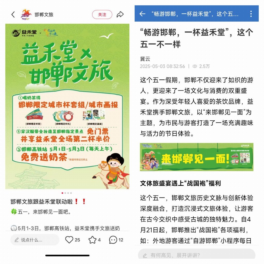 这个五一假期,益禾堂与河北邯郸文旅的破圈联动引发全民热议。两大品牌通过深度融合传统文化与现代消费场景,推出"益杯千年 茶香邯郸"城市文化推广计划,以一杯奶茶为引,携手邯郸文旅,溯千年文化长河。整个五一假期,实现益禾堂邯郸区域GMV同比增长188%的亮眼成绩,成功打造文旅跨界营销新范式。