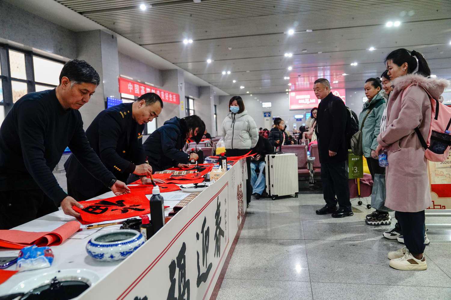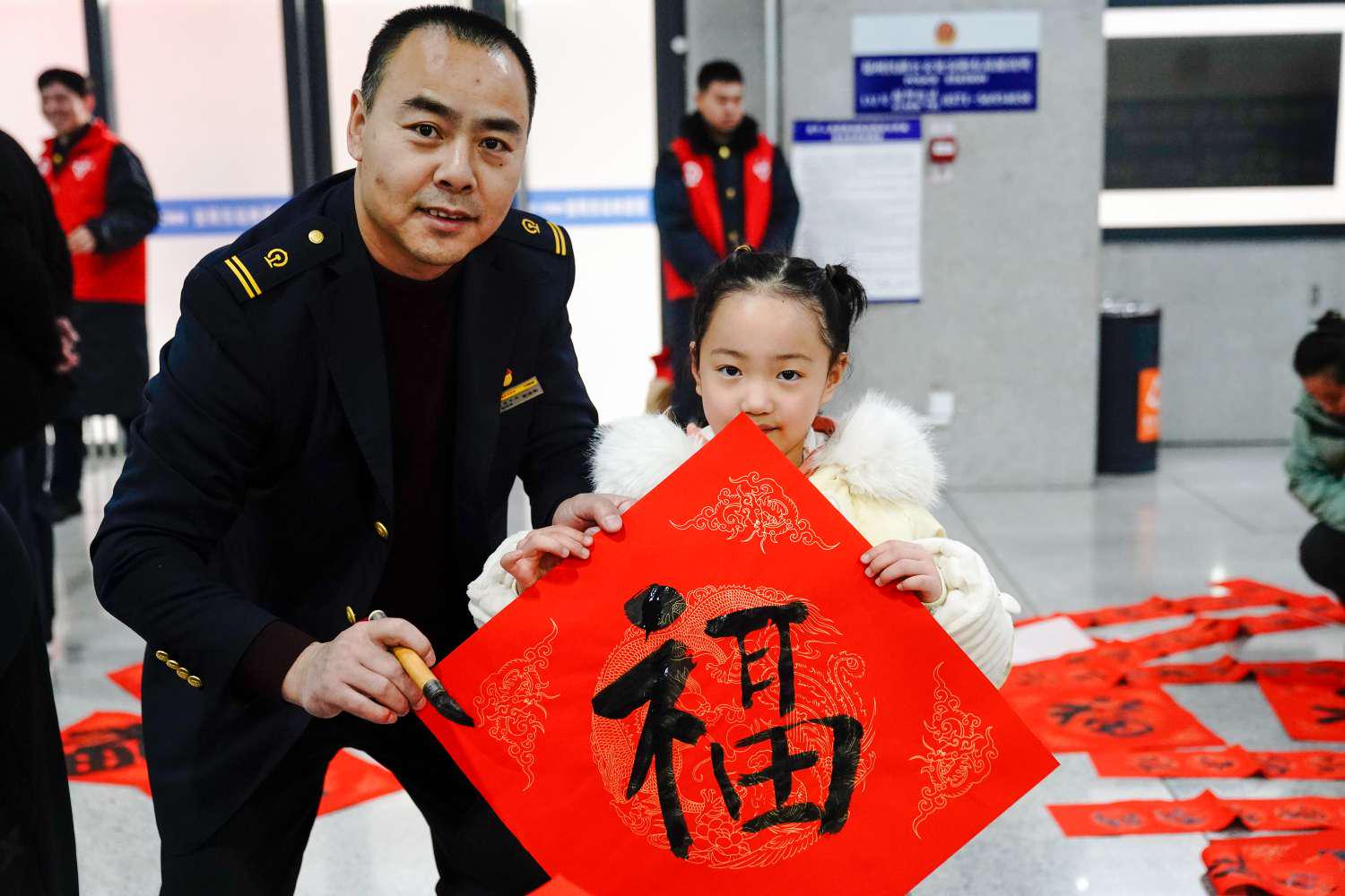 2月2日,河南省郑州局集团有限公司安阳综合段举办春运首日活动,在候车厅内,路内外书法家挥毫泼墨,为旅客写下新春祝福。