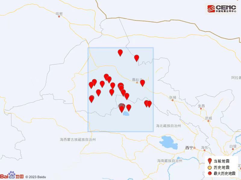根据中国地震台网速报目录,震中周边200公里内近5年来发生3级以上地震共37次,最大地震是2022年3月26日在青海海西州德令哈市发生的6.0级地震(距离本次震中104公里)。