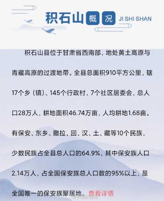 积石山县位于甘肃省西南部,地处黄土高原与青藏高原的过渡地带。全县总面积910平方公里,辖17个乡(镇)、145个行政村、7个社区居委会,总人口28万人,耕地面积46.74万亩,人均耕地1.68亩。有保安、东乡、撒拉、回、汉、土、藏等10个民族,少数民族占全县总人口的64.9%,其中保安族人口2.14万人,占全国保安族总人口数的95%以上,是全国唯一的保安族聚居地。愿平安!