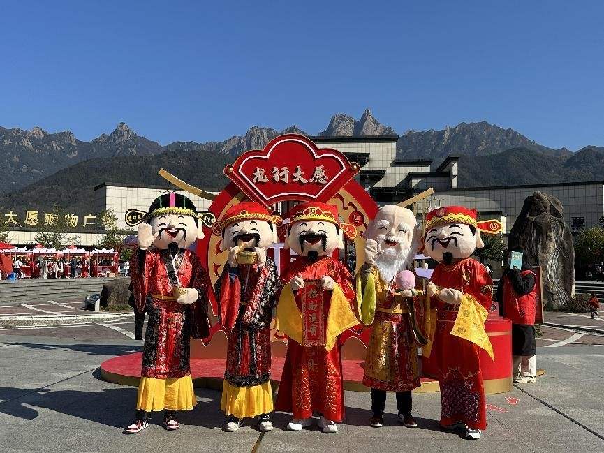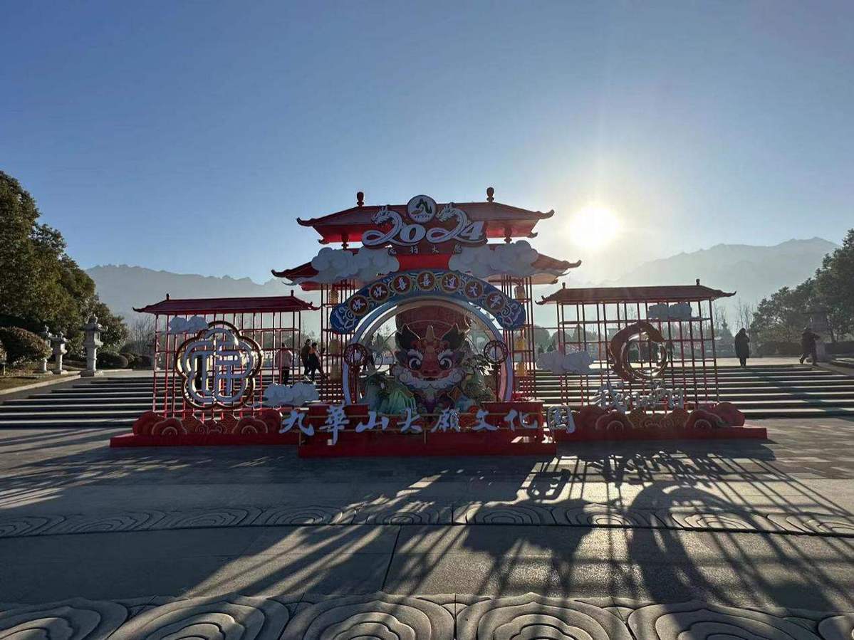 文化园以年轻化、潮流化、互动化为方向,打造具有九华文化资产属性的系列IP。瑞兽、五福,都承载着老百姓美好生活的期盼,在“瑞兽送福集章打卡”活动中,谛听形象的瑞兽深受游客喜爱。“舞板龙”“插龙旗”“系龙须”“挂龙红”,龙元素随处可见。园内设置“福禄寿喜财”打卡点,将祝福嵌入到园区游览动线,更有“福禄寿喜财巡游”为游客带来新春吉祥祝福,游客纷纷拍照留念。园区设置了十个打卡点,一步一景皆有底蕴。在行走中收获祝福,有印章链接传统文化,引导游客沉浸式地感受文化园的建筑、艺术和文化之美。