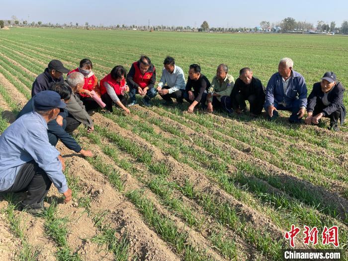 在菏泽市定陶区的麦田里,农技专家服务队队员仔细查看小麦当前墒情、苗情,为种植户讲解水肥管理、病虫害防治等知识,现场把脉问诊、答疑解惑,并提出具有针对性的技术指导。