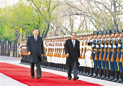 四月九日下午,国家主席习近平在北京人民大会堂同来华进行国事访问的密克罗尼西亚联邦总统西米纳举行会谈。这是会谈前,习近平在人民大会堂东门外广场为西米纳举行欢迎仪式。