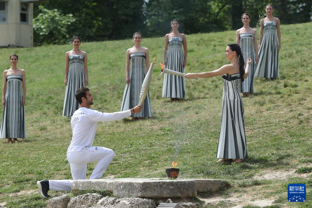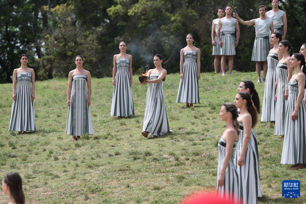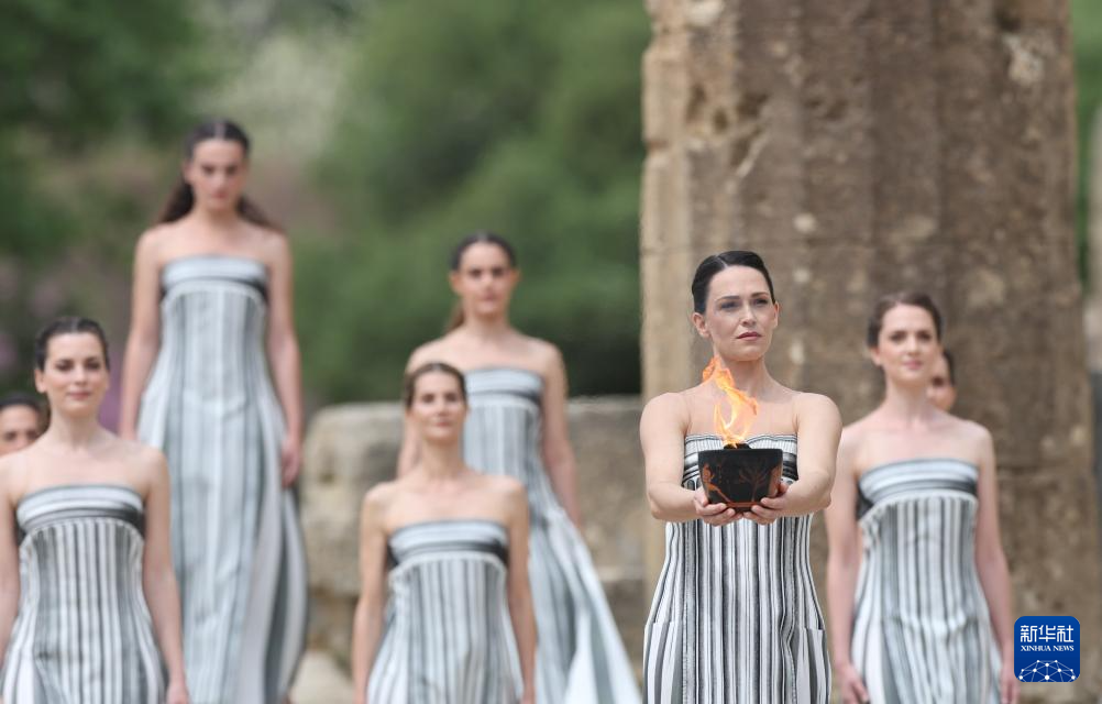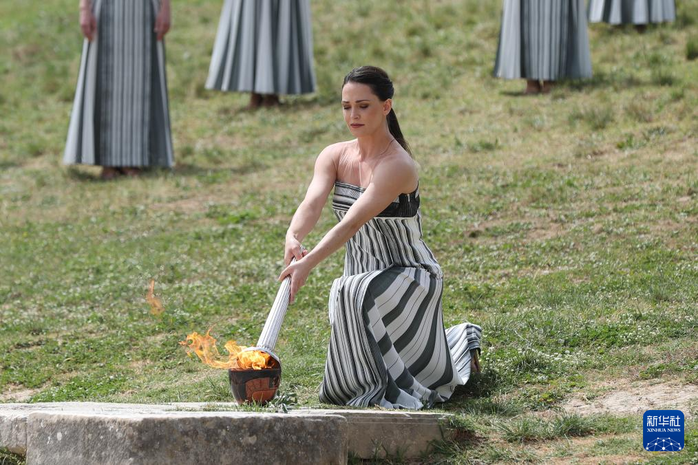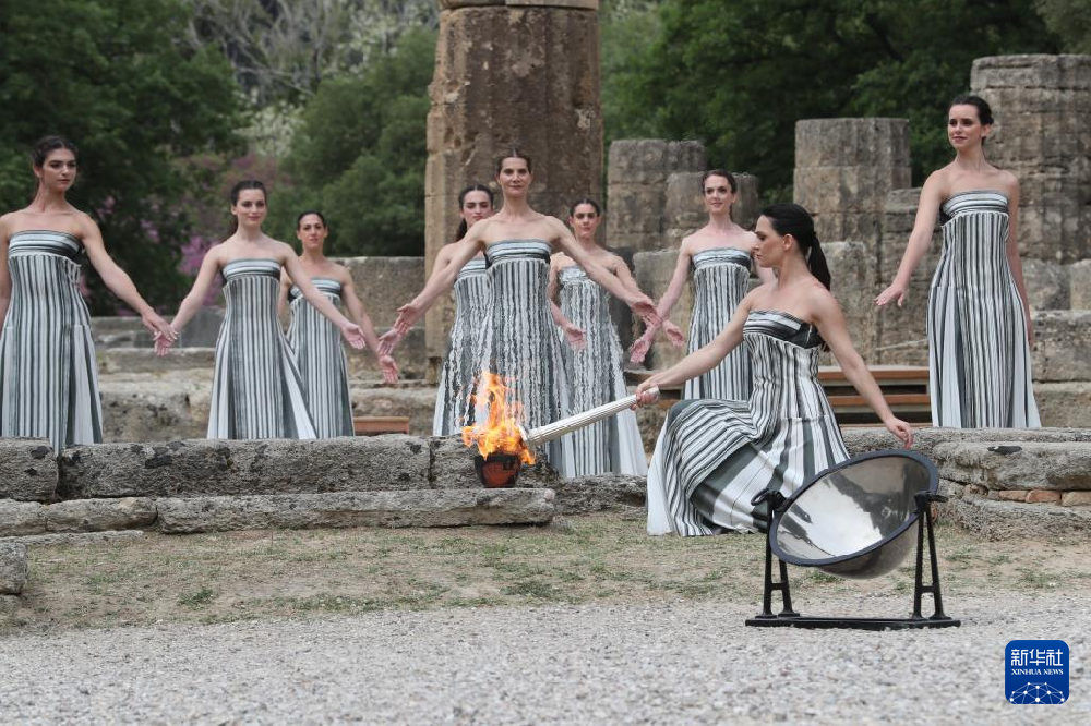 当地时间12时16分,在有2500多年历史的赫拉神庙遗址前,由希腊女演员玛丽·米娜扮演的古希腊女祭司向光明之神阿波罗祈祷后点燃了火种。由于现场多云,火种点燃环节没有采用传统的凹面镜取火,而是选用了此前备用的火种。