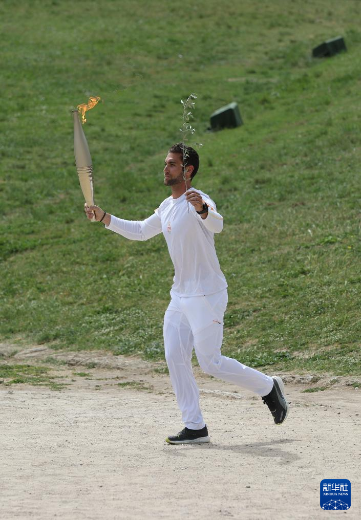 采集仪式结束后,女祭司将燃起的火炬及象征和平与荣耀的橄榄枝传递给第一棒火炬手、希腊运动员、东京奥运会男子赛艇金牌得主斯特凡诺斯。