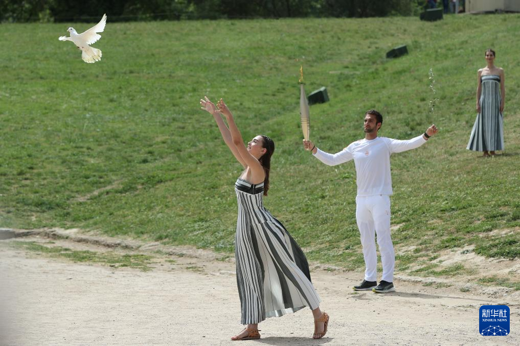 4月16日,第一棒火炬手——希腊运动员、东京奥运会男子赛艇项目金牌得主斯特凡诺斯·恩图斯科斯(前左)从扮演最高女祭司的演员玛丽·米娜手中接过橄榄枝。新华社记者 赵丁喆 摄