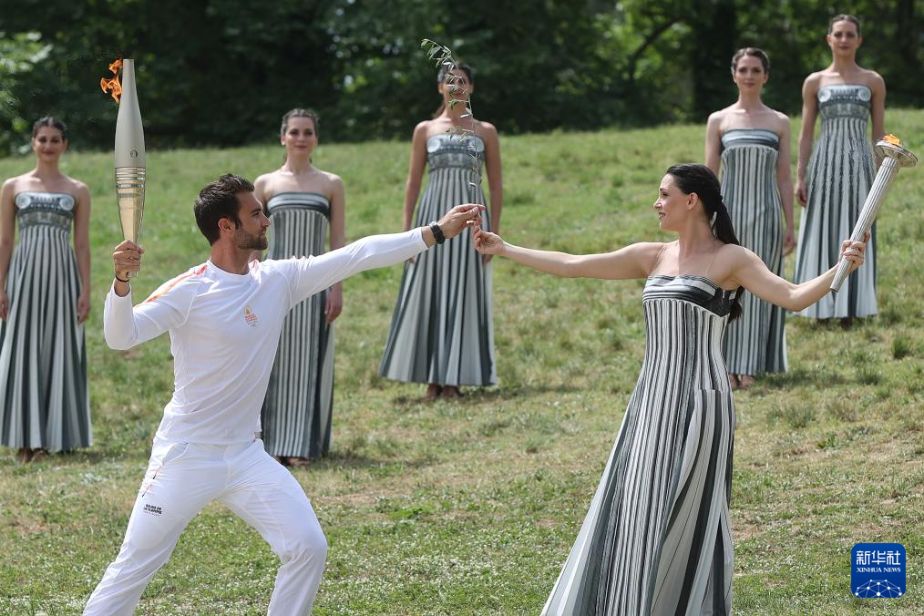 4月16日,扮演最高女祭司的演员玛丽·米娜(前右)点燃第一棒火炬手——希腊运动员、东京奥运会男子赛艇项目金牌得主斯特凡诺斯·恩图斯科斯手中的火炬。新华社记者 赵丁喆 摄