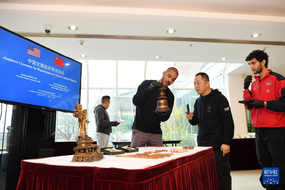 4月17日,在美国纽约中国驻纽约总领馆,工作人员点交中国流失文物艺术品。新华社记者 李睿 摄