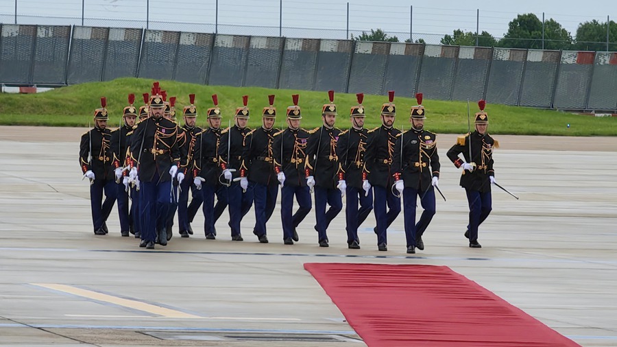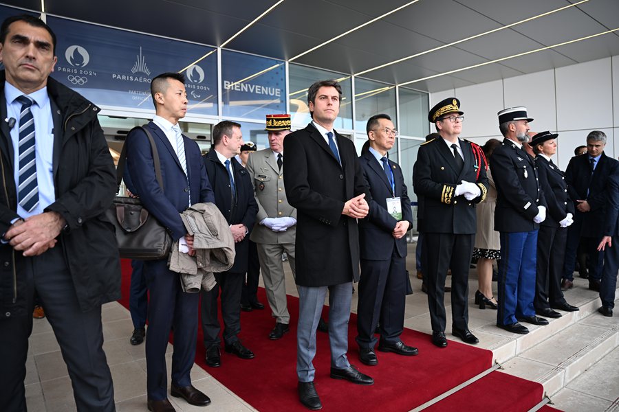 习近平乘坐专机抵达巴黎奥利机场时,法国总理阿塔尔等法国政府高级代表热情迎接。