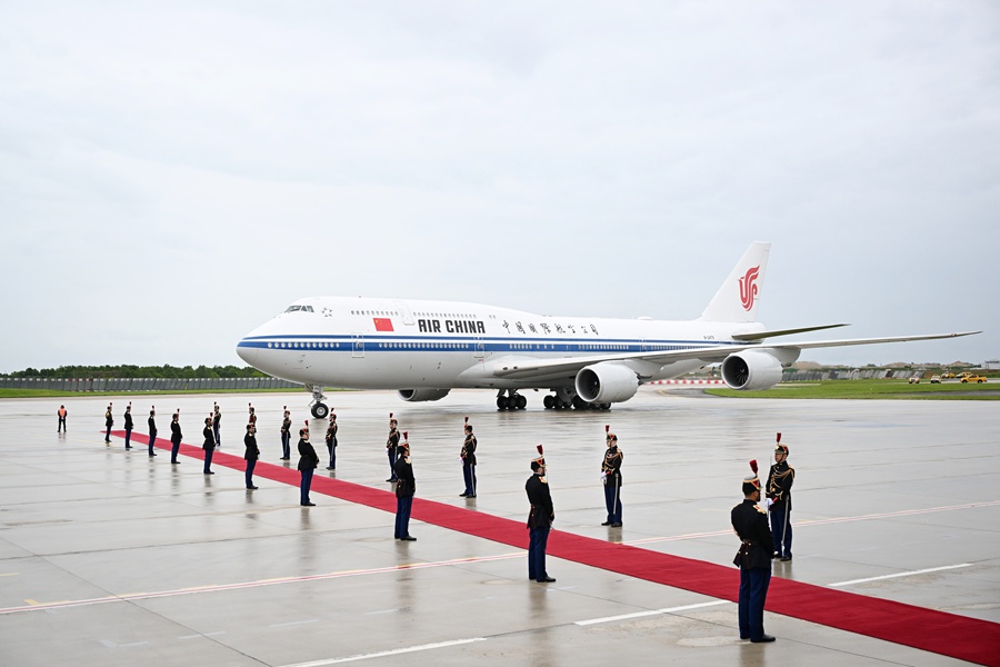 当地时间5月5日下午,国家主席习近平乘专机抵达巴黎,应法兰西共和国总统马克龙邀请,对法国进行国事访问。