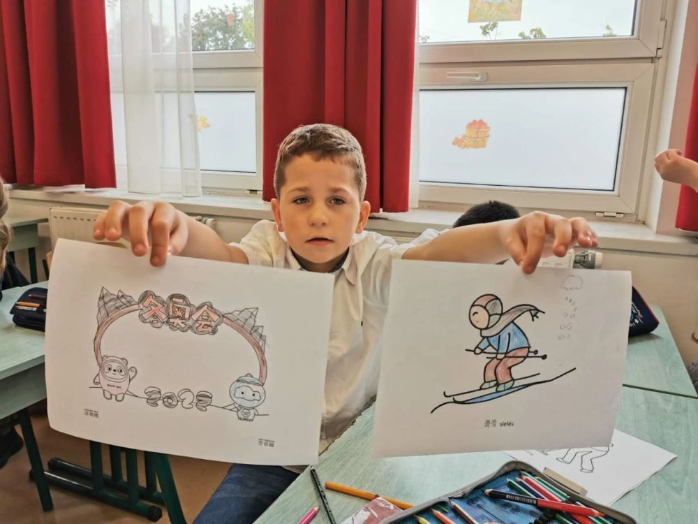 △匈中双语学校学生展示具有冬奥元素的填图画 。