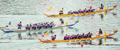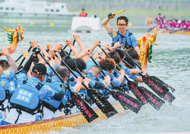 选手们手中的船桨快速翻飞,驱动龙舟狂飙。 杨践 摄