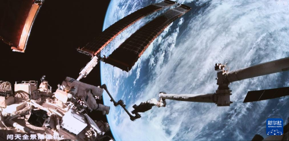5月28日在北京航天飞行控制中心拍摄的神舟十八号航天员在空间站组合体舱外作业的画面。新华社记者 李杰 摄