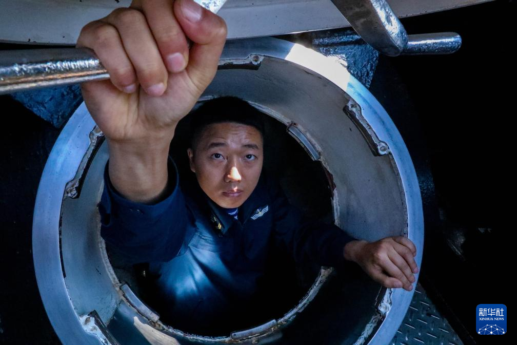 海军某潜艇支队任务潜艇出航前进行备航备潜,艇员关闭水密门(资料照片)。新华社发(茆琳摄)