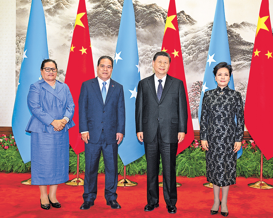 四月九日下午,国家主席习近平在北京人民大会堂同来华进行国事访问的密克罗尼西亚联邦总统西米纳举行会谈。会谈前,习近平和夫人彭丽媛为西米纳和夫人安瑟莉举行欢迎仪式。新华社记者 李学仁摄四月九日下午,国家主席习近平在北京人民大会堂同来华进行国事访问的密克罗尼西亚联邦总统西米纳举行会谈。这是会谈前...