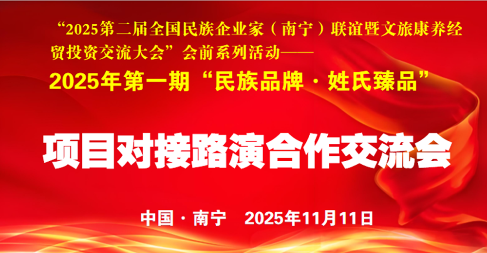2025年11月11日下午,在国家“民族文化振兴”战略引领下,为推动民族品牌市场化发展、赋能姓氏文化IP创新,由“2025第二届全国民族企业家(南宁)联谊暨文旅康养经贸投资交流大会”(以下简称:“全国民企大会”)组委会指导,广西民族文化发展研究会、桂族文研(广西)文化发展有限公司等支持,广西象善商贸有限公司主办,“姓氏臻品”商城全国运营总部与广西九黎瑶药基地大健康产业有限公司联合承办,2025年第一期“民族品牌•姓氏臻品”项目路演交流会在南宁市江南区丽江村商贸城三楼隆重举行。...
