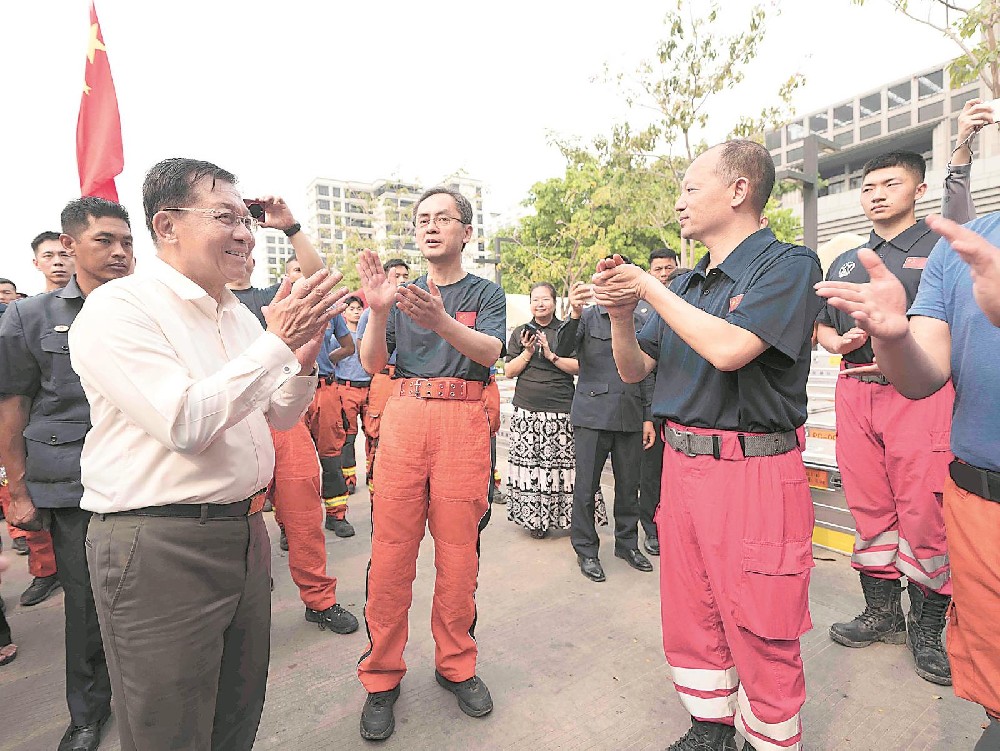 4月6日,在缅甸曼德勒中国救援队伍营地,缅甸领导人敏昂莱(前左一)慰问中国救援队伍。4月6日下午,缅甸领导人敏昂莱来到曼德勒中国救援队伍营地慰问中国救援队、由中国军队参与组派的中国国际救援队、中国香港特区救援队全体成员,对中方救援队伍震后到缅全力救援表示感谢。截至4月6日,中国救援队伍在缅甸共搜救出9名幸存者。新华社记者 才扬 摄...
